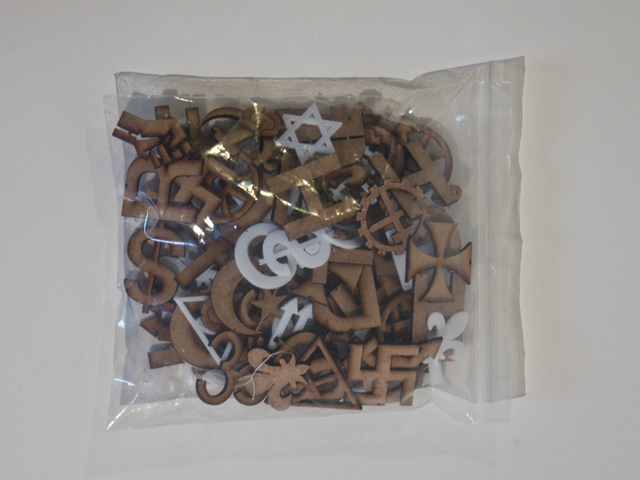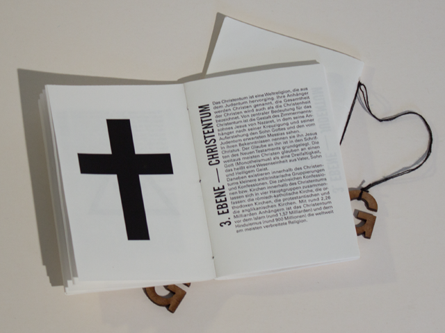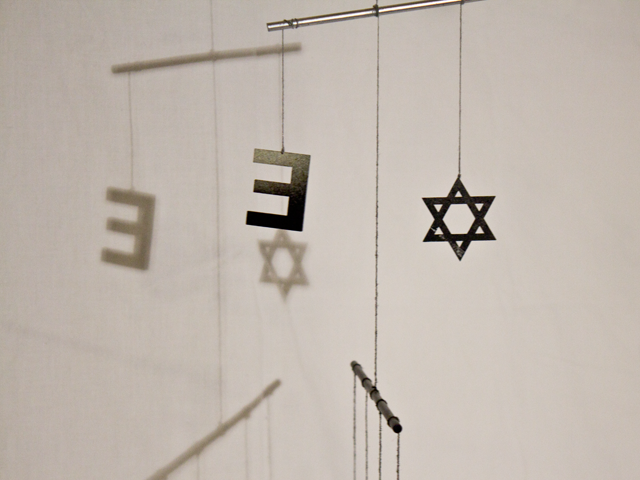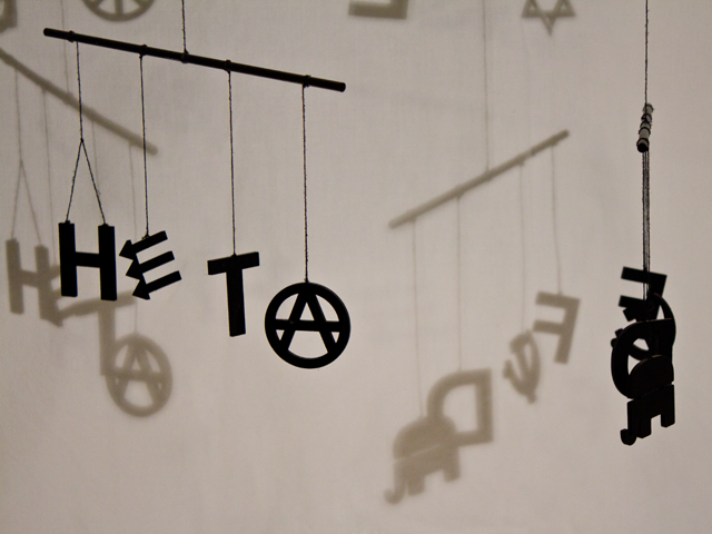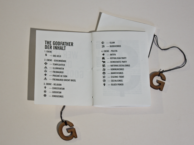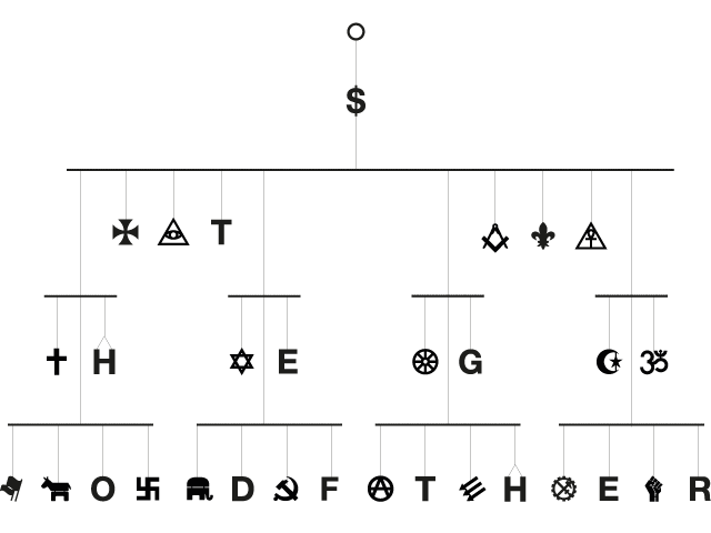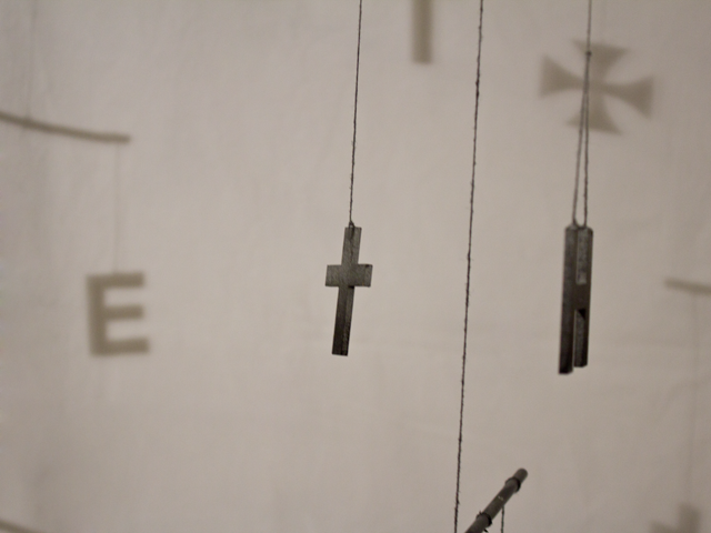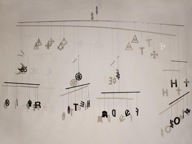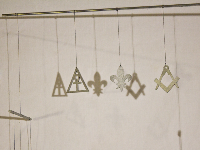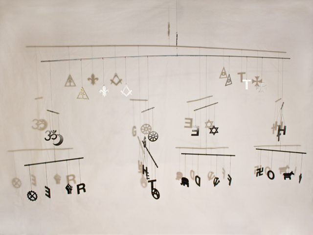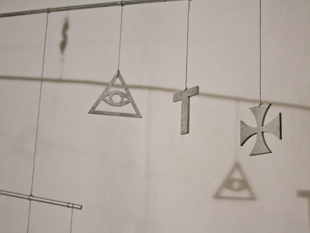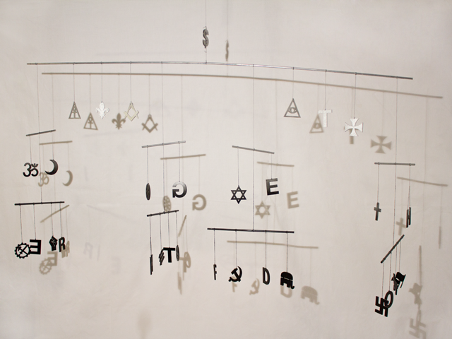 In der Mafia herrschen streng hierarchische Strukturen. An einen Gottvater muss man glauben. Glauben und Hierarchie zusammenzuführen habe ich in diesem Mobile versucht. Ideologien leben davon dass Menschen an sie glauben. Ganz oben steht das Geld, das kapitalistische System, darunter die Geheimbünde, dann die Religionen und unter diesen die politische Ideologien.